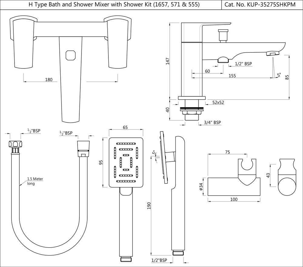 H Type Bath and Shower Mixer with Shower Kit (1657, 571 & 555)